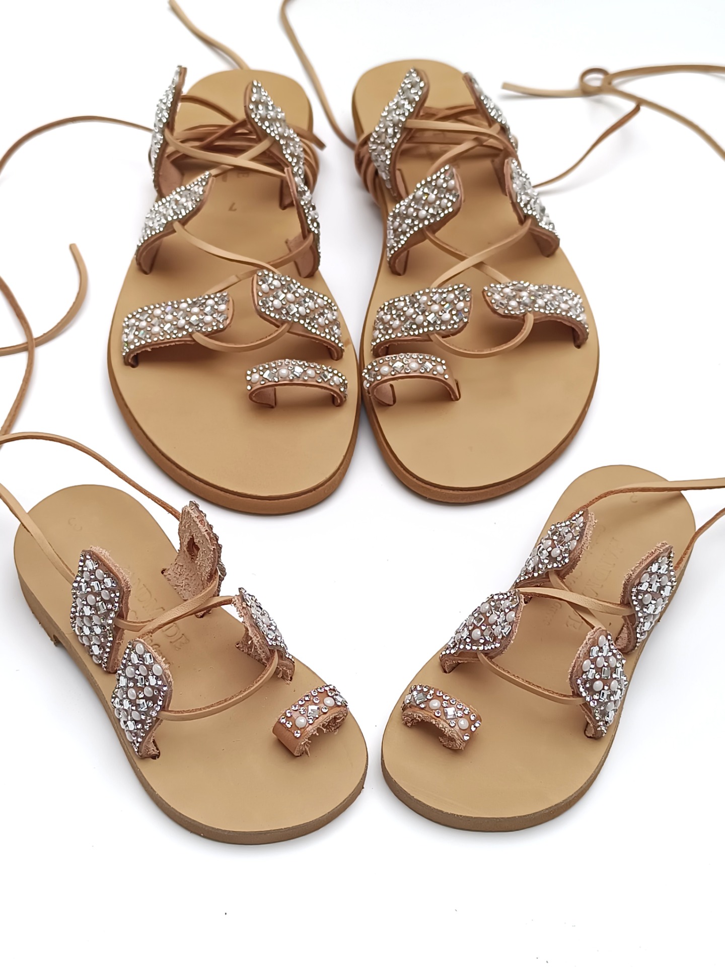 Λάμψη και κομψότητα στα βήματά σας! ✨ Χειροποίητα δερμάτινα σανδάλια διακοσμημένα με λαμπερές πέρλες και στρας για κάθε περίσταση. Ανακαλύψτε την καλοκαιρινή μας συλλογή και νιώστε μοναδικές!